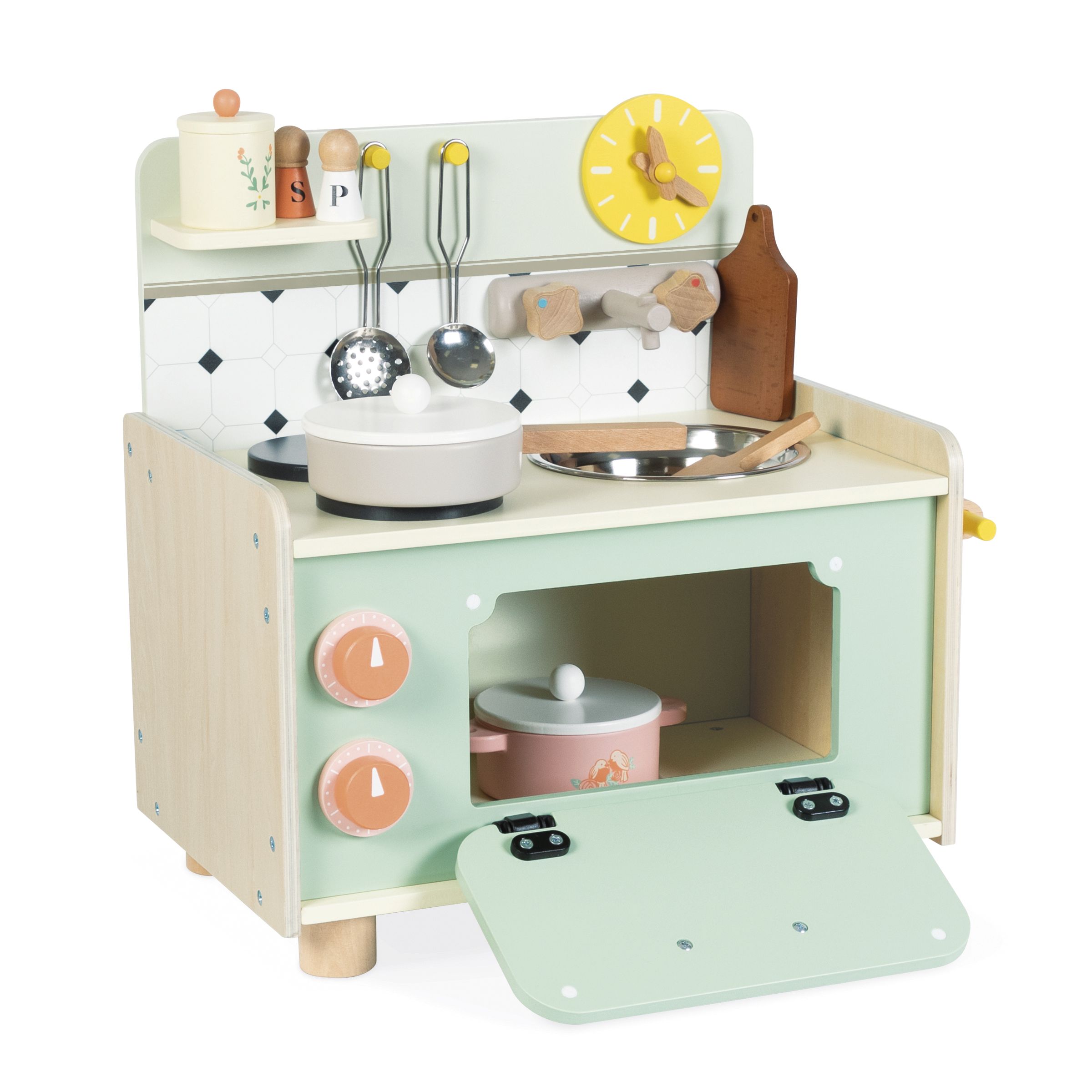 Equipado con horno, vitrocerámica, fregadero, una balda para colocar las especias y un reloj para fomentar el aprendizaje de la hora, este juguete incluye 9 cacharros de cocina que permitirán a los pequeños imitar a los adultos mientras desarrollan su imaginación y habilidades motoras.