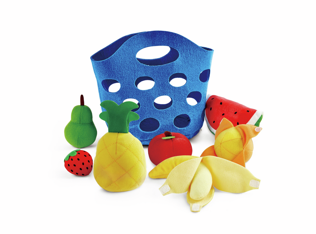 Llena esta cesta de fieltro suave con siete piezas de tus frutas favoritas de la marca Hape.