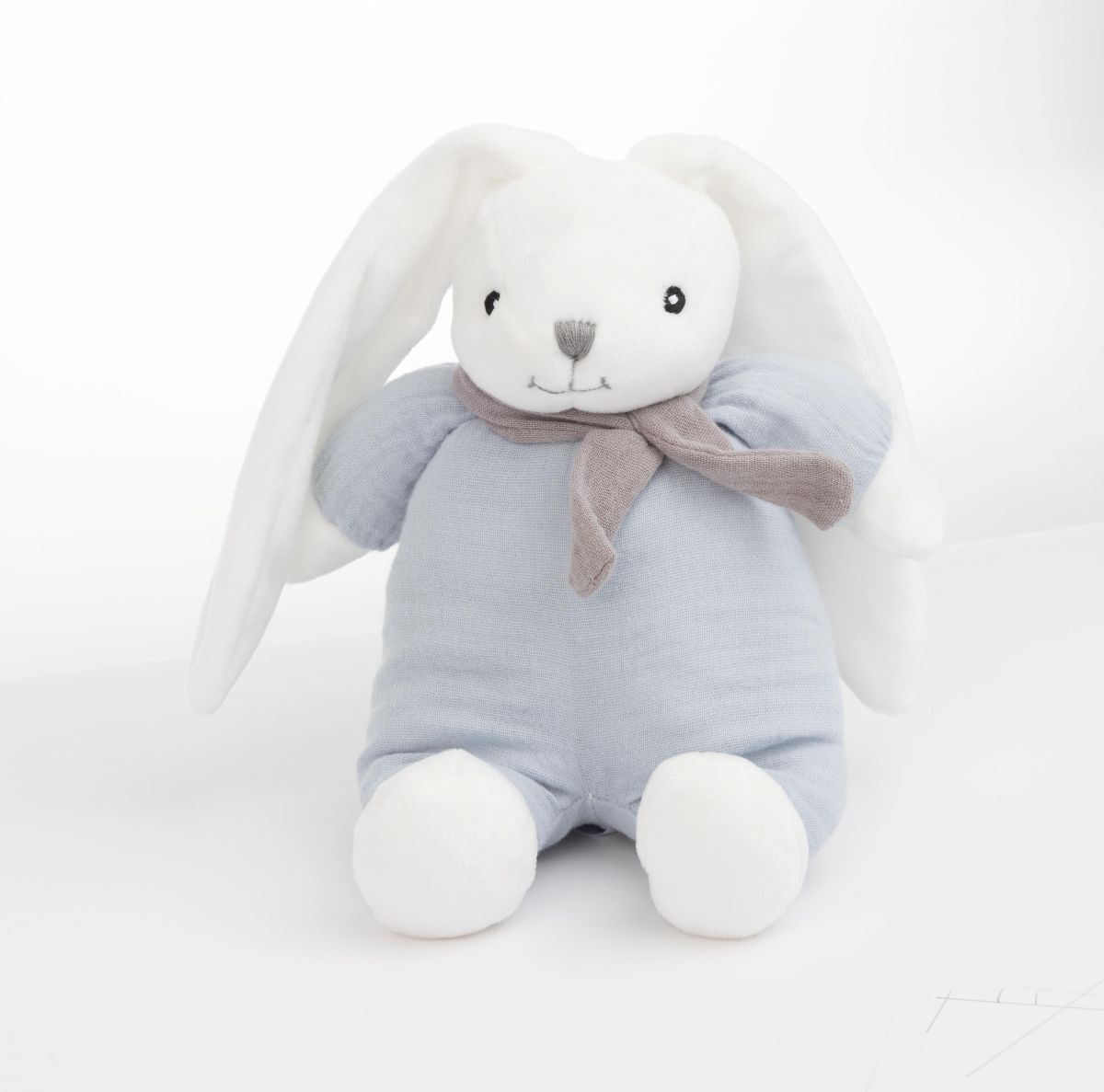 Este precioso conejo de peluche con el cuerpo de muselina azul ,de la marca Artesavi ,es muy suave y con una textura muy agradable. Sus ojos, nariz y boca están bordados garantizando la seguridad del bebé.