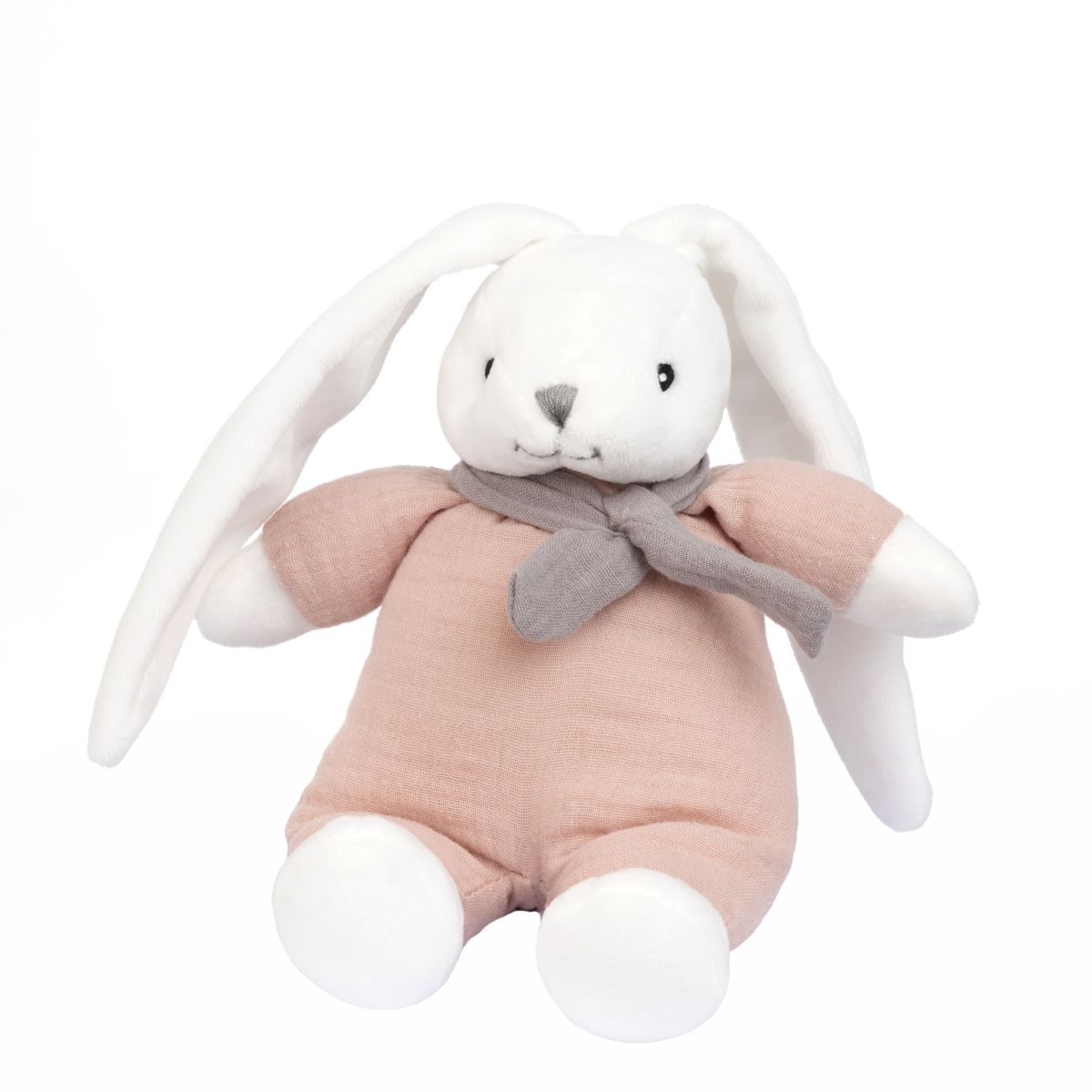 Este precioso conejo de peluche con el cuerpo de muselina rosa ,de la marca Artesavi ,es muy suave y con una textura muy agradable. Sus ojos, nariz y boca están bordados garantizando la seguridad del bebé.