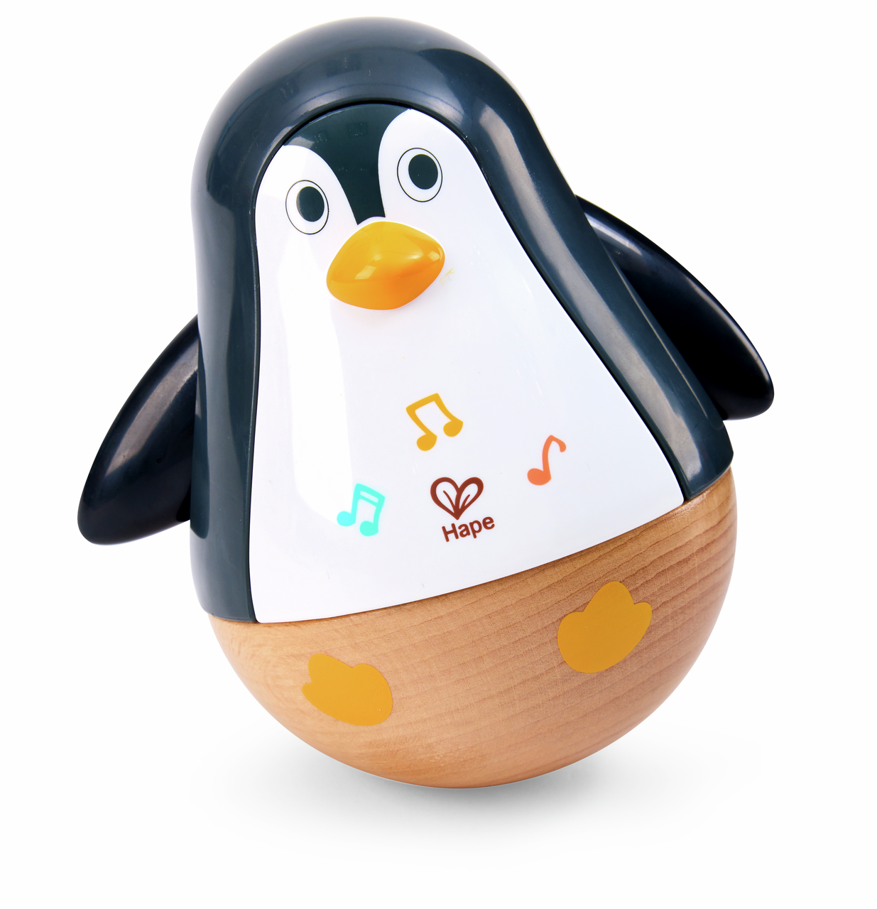 Este atractivo set de juguetes de la marca Hape,con temática de pingüinos incluye un pingüino grande que se balancea y dos huevos de pingüino más pequeños que hacen ruido, diseñados para cautivar a los bebés con sonidos y movimientos.