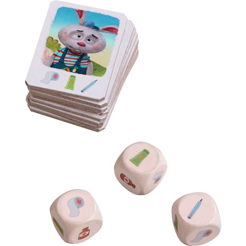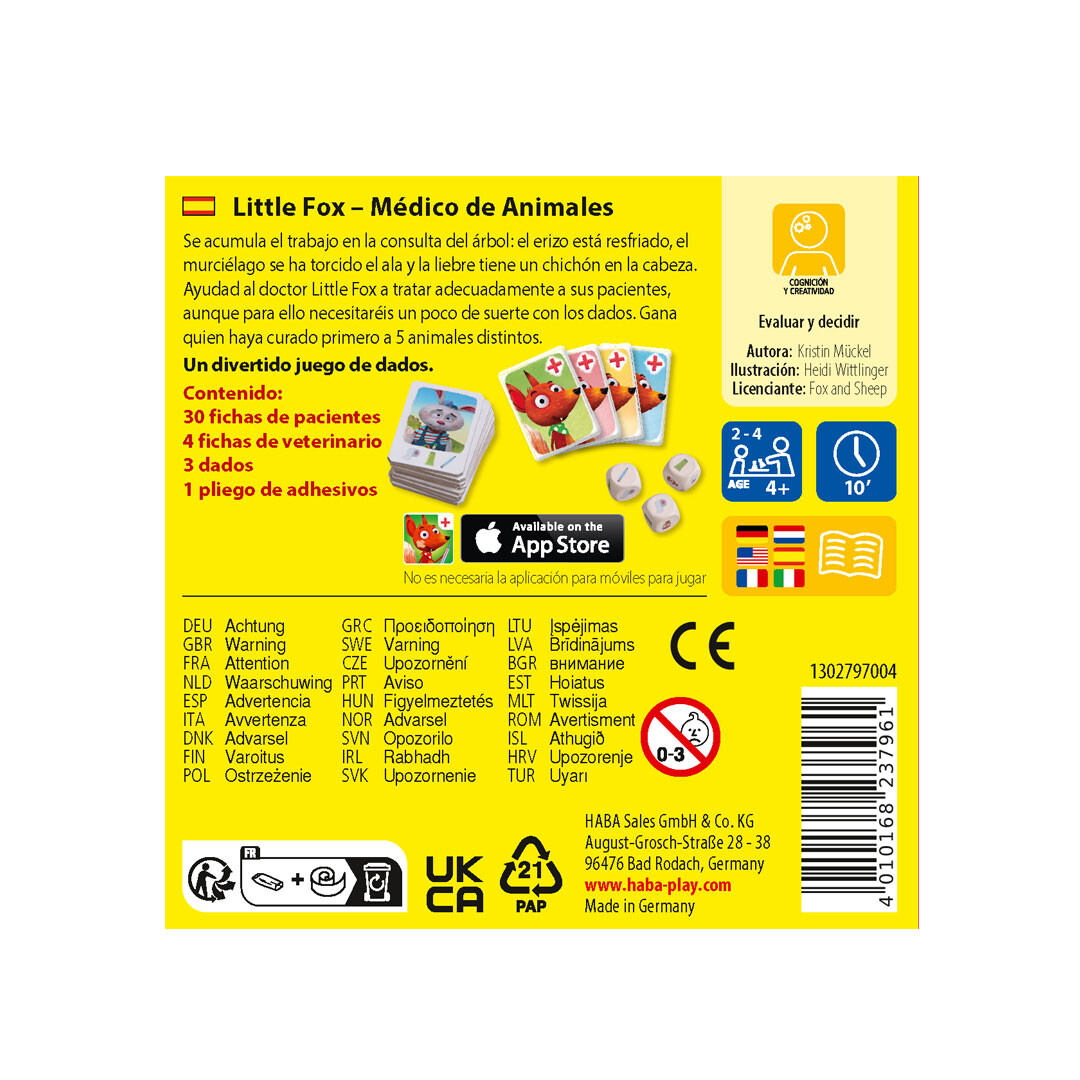 ?? Contenido: 30 fichas de pacientes, 4 fichas veterinario, 3 dados, pliego de adhesivos, instrucciones