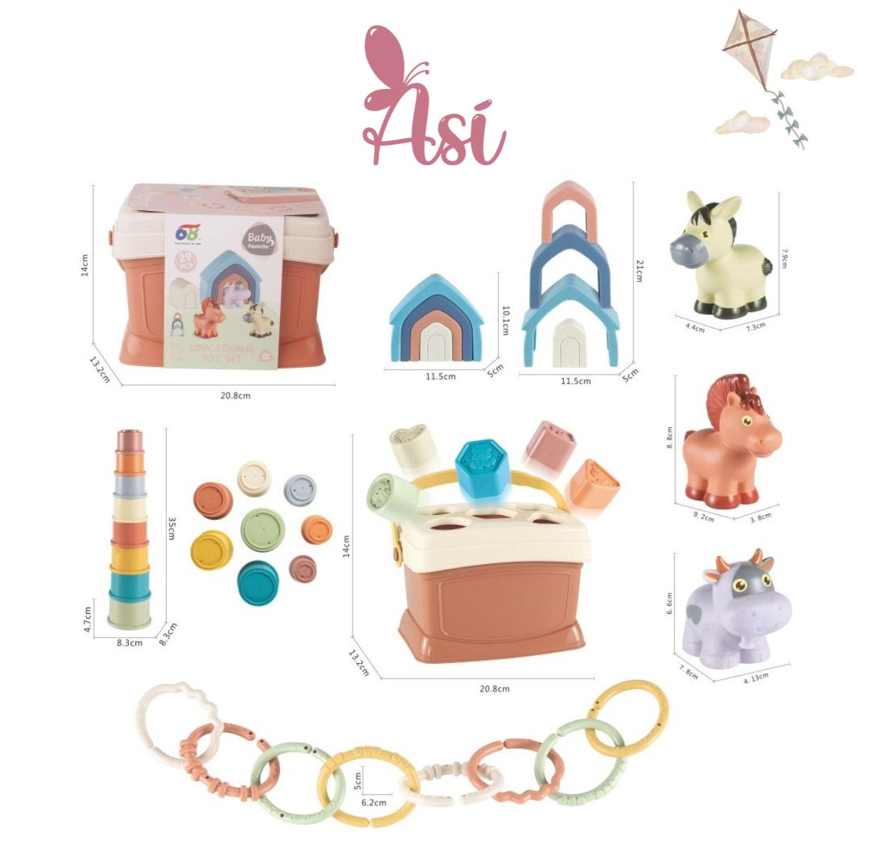 El set incluye una resistente caja que contiene más de 24 piezas, entre ellas apilables, elementos de construcción y simpáticos muñecos de animales de granja.