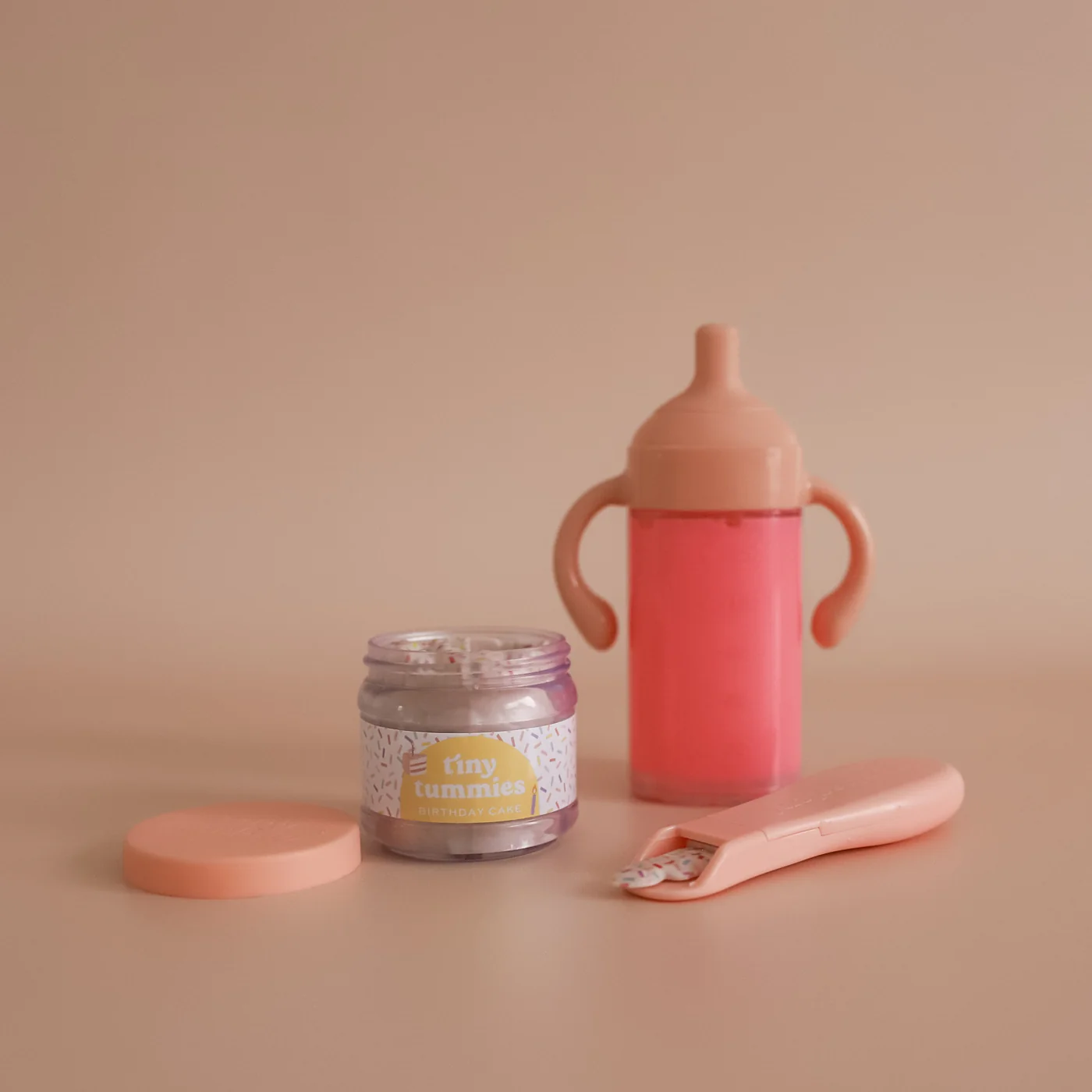 El set de comida y bebida Tiny Harlow incluye un vasito con asas mágico y un tarrito de comida para muñecas con sabor a pastel de cumpleaños. El vasito simula leche de fresa que desaparece al inclinarlo, mientras que la cuchara hace aparecer comida al tocar los labios de la muñeca, creando una experiencia realista y divertida que encantará a los pequeños.