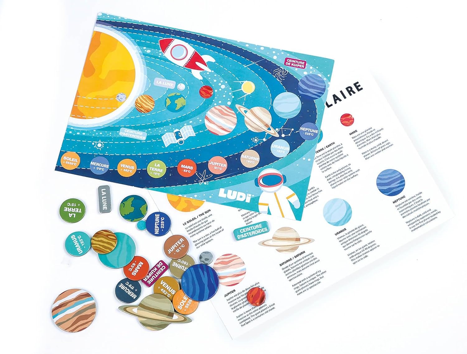 »El Sistema Solar» de Ludi! En suave algodón bordado, para aprender y jugar con el sistema solar de una manera divertida e informativa. Este sistema solar de la marca contiene de 21 piezas de velcro como cohetes y planetas, proporcionando una experiencia de aprendizaje interactiva.